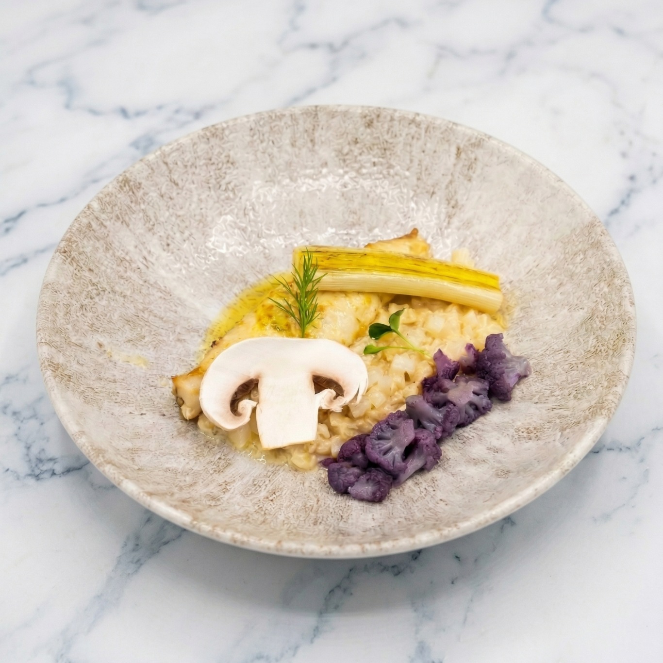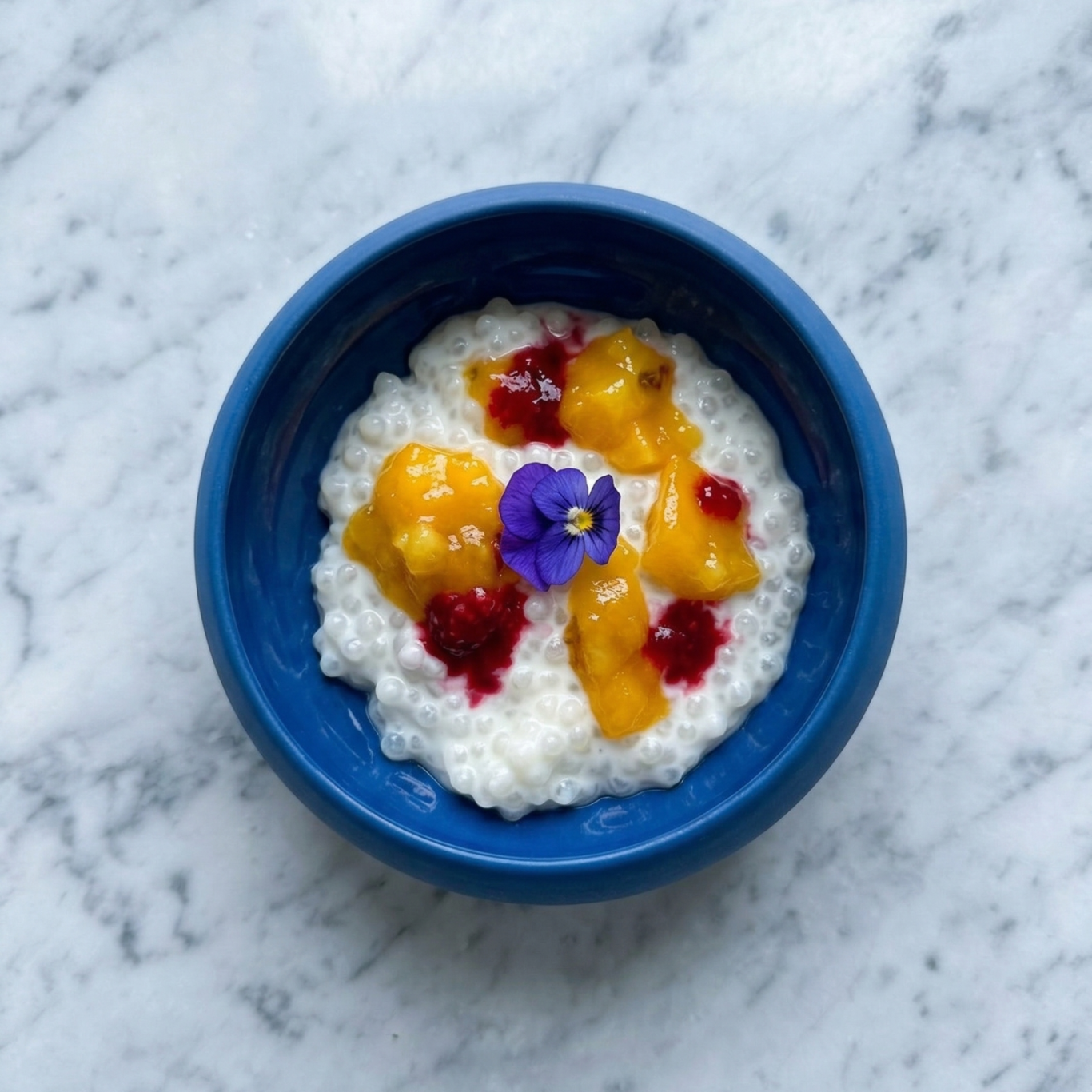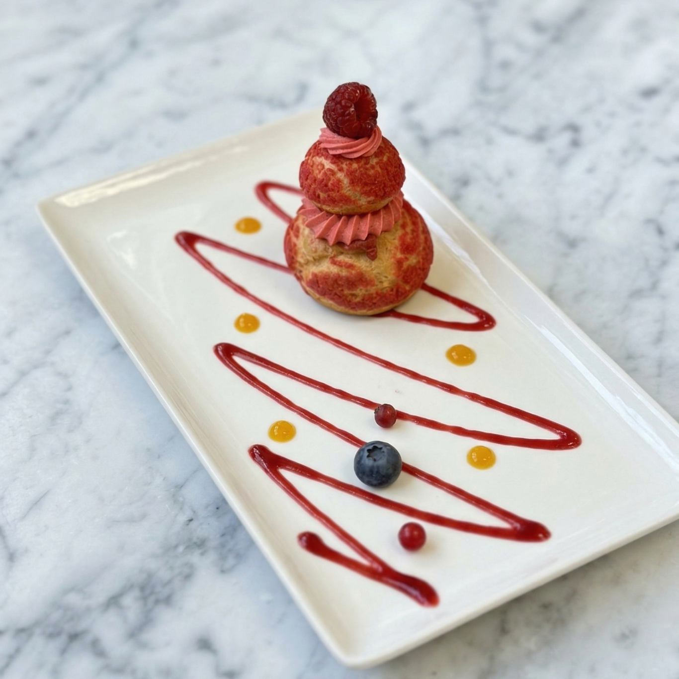 Une composition fraîche et légère autour de textures gourmandes, sublimée par des fruits et une touche florale. Une assiette visuellement élégante qui allie douceur et fraîcheur.