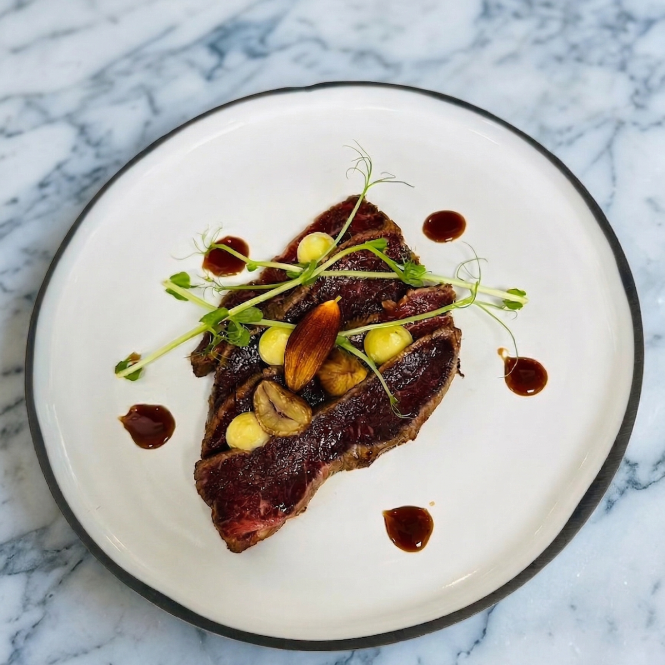Une pièce de viande travaillée avec précision, accompagnée de touches gourmandes et d’un jus intense. Un dressage épuré qui met en valeur le produit.
